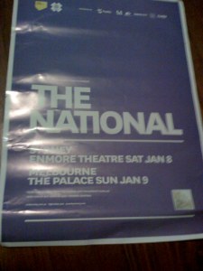 Here’s a poster that was up in the Melbourne CBD advertising that The National will be playing a Falls Festival sideshow at The Palace Theatre in Melbourne on January 9th, as well as in Sydney at the Enmore Theatre on January 8th.